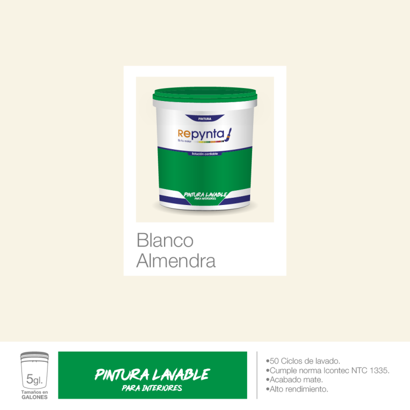 VINILO TIPO 2 LAVABLE BLANCO CUÑETE REPYNTA El Vinilo Tipo 2 Pintura Lavable Repynta es la solución perfecta para tus proyectos de decoración. Con su fórmula lavable, ofrece una fácil limpieza y mantenimiento, manteniendo tus espacios impecables. Su tono blanco brillante añade luminosidad y amplitud a cualquier ambiente. Este vinilo de calidad superior cuenta con una excelente resistencia al desgaste y una durabilidad excepcional. Aplicación sencilla y secado rápido permiten un trabajo eficiente. Transforma tus paredes con confianza, sabiendo que estás utilizando un producto confiable y de alto rendimiento. Eleva tus espacios a un nuevo nivel de estilo y funcionalidad con el Vinilo Tipo 2 Pintura Lavable Repynta.
