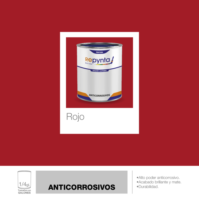 ANTICORROSIVO BLANCO CUARTO GALON REPYNTA El Anticorrosivo Repynta es la solución perfecta para proteger tus superficies metálicas de la corrosión. Con su fórmula de alta calidad, ofrece una resistencia excepcional contra los efectos del óxido y la corrosión, prolongando la vida útil de tus estructuras. Su fácil aplicación permite cubrir de manera uniforme, brindando una protección duradera. Disponible en una variedad de colores, puedes elegir el que mejor se adapte a tus necesidades estéticas. Confía en el Anticorrosivo Repynta para mantener tus superficies metálicas protegidas, duraderas y con un aspecto impecable en cualquier entorno, ya sea en interiores o exteriores.