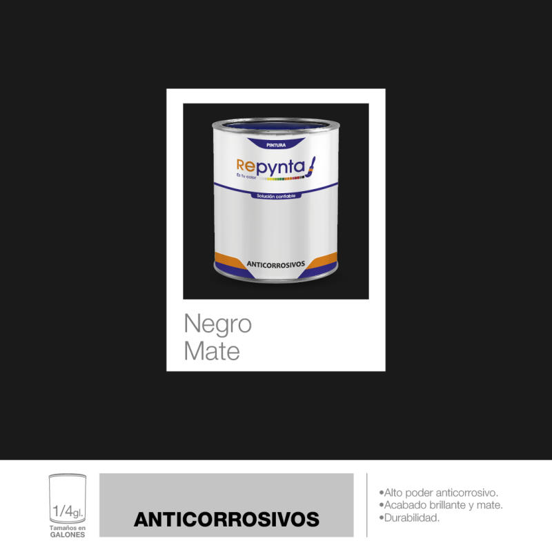 ANTICORROSIVO BLANCO CUARTO GALON REPYNTA El Anticorrosivo Repynta es la solución perfecta para proteger tus superficies metálicas de la corrosión. Con su fórmula de alta calidad, ofrece una resistencia excepcional contra los efectos del óxido y la corrosión, prolongando la vida útil de tus estructuras. Su fácil aplicación permite cubrir de manera uniforme, brindando una protección duradera. Disponible en una variedad de colores, puedes elegir el que mejor se adapte a tus necesidades estéticas. Confía en el Anticorrosivo Repynta para mantener tus superficies metálicas protegidas, duraderas y con un aspecto impecable en cualquier entorno, ya sea en interiores o exteriores.