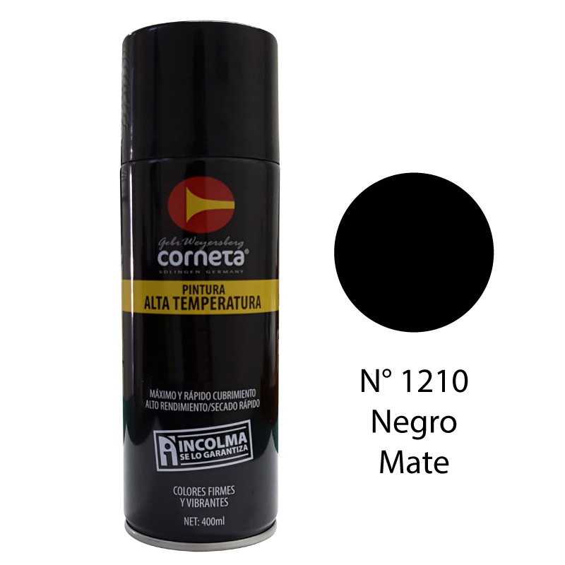 PINTURA CORNETA N1200 ALTA TEMPERATURA NEGRO La pintura Corneta N1200 en color negro de alta temperatura es ideal para proyectos que requieren resistencia al calor y durabilidad. Su tono negro profundo agrega un toque de elegancia y sofisticación a cualquier superficie. Con excelente poder cubriente y adherencia, garantiza un acabado duradero y resistente al calor. La pintura se seca rápidamente, lo que permite una aplicación eficiente y un resultado profesional. Perfecta para artistas, diseñadores y usuarios que buscan una pintura de alta calidad y alto rendimiento para obtener un acabado negro de alta temperatura atractivo y resistente en sus proyectos.