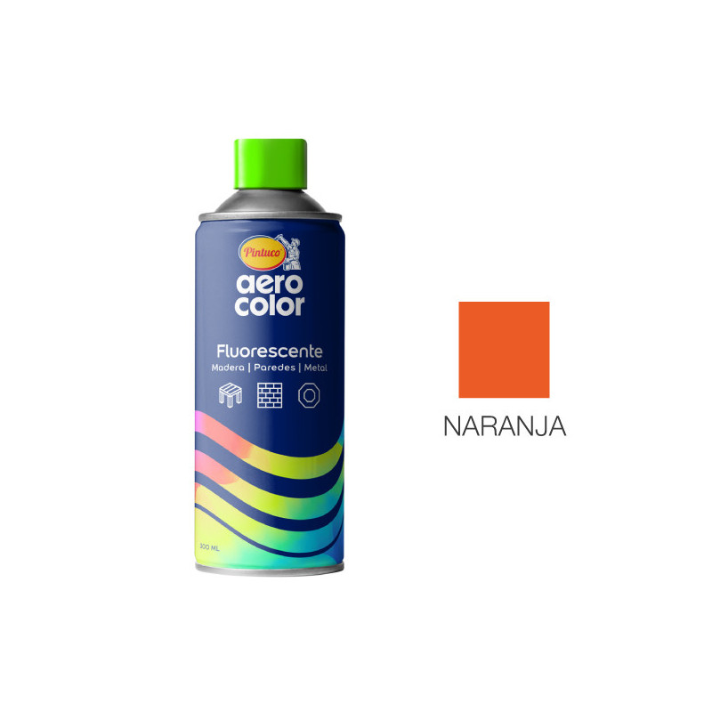 Información General Aerocolor Pintura Fluorescente en Aerosol se usa en superficies como madera, metal, cartón o paredes, es ideal para elaborar avisos publicitarios y señales de seguridad. De colores vivos que dan brillo y proporcionan mayor visibilidad, con alto cubrimiento, alto rendimiento, mayor duración y un rápido secamiento. Para uso en interiores y exteriores Recomendado para aplicar como base y acabado final en superficies interiores y exteriores bajo techo tales como mampostería, concreto, estuco, ladrillo, madera, entre otros. Beneficios Estos son algunos de los beneficios que te ofrece Aerocolor Pintura Fluorescente en Aerosol: Aerosol: Colores vivos. Brillo y mayor visibilidad. Alto cubrimiento y alto rendimiento. Rápido secamiento Para uso en interiores y exteriores. Colores Haz clic y descarga la carta de color Prepara la Superficie: La superficie que vas a pintar debe estar seca, libre de mugre, polvo, óxido y grasa. Si la vas a aplicar sobre una superficie ya pintada te recomendamos lijar y remover la pintura existente para obtener una mejor adherencia. Te recomendamos aplicar previamente una base blanca para que el color resalte. Prepara el producto: Invierte el envase y agítalo 1 minuto aprox. hasta que suene el balín. Hazlo antes y durante la aplicación. Realiza una prueba para verificar el color que deseas usar, aplicando sobre otro material. Aplica el producto: Aplica la pintura a 30 cm (aprox.) de la superficie. Pinta en sentido horizontal o vertical. Hazlo por capas delgadas dejando secar entre capa y capa. Elige un lugar ventilado, sin polvo y en un día cálido. Cuando termines de pintar, invierte el aerosol y oprime el actuador hasta que sólo salga gas. En caso de que el actuador se obstruya, retíralo del aerosol y sumérgelo en thinner, luego introduce en la base y en el orificio de salida un alfiler para limpiarlo. Sobre Metal y Madera..1,5 m²/300 ml a 2 capas* *Sobre las demás superficies el rendimiento puede variar.