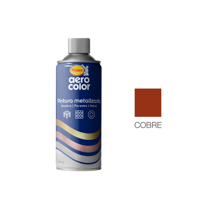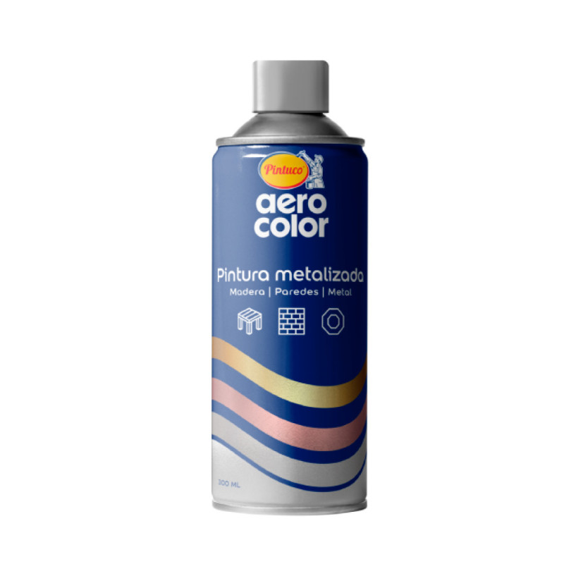 Pintura en Aerosol Metalizada ideal para madera, metal, cerámica o cartón que requieran restauración, protección y/o decoración. Con un acabado metálico uniforme, de mayor resistencia y duración con alto cubrimiento, rendimiento superior y un rápido secamiento. Para uso en interiores y exteriores. Información General Aerocolor Pintura en Aerosol Metalizada con alta adherencia y durabilidad en superficies como madera, metal, cerámica o cartón que requieran restauración, protección y/o decoración. Da un acabado metálico uniforme, de mayor resistencia y duración con alto cubrimiento, rendimiento superior y un rápido secamiento. Beneficios Estos son algunos de los beneficios que te ofrece Aerocolor Pintura en Aerosol metalizada Alta Adherencia. Mayor Resistencia y durabilidad. Alto cubrimiento. Alto rendimiento. Rápido secamiento. Para uso en interiores y exteriores. Colores Haz clic y descarga la carta de color Prepara la Superficie: La superficie que vas a pintar debe estar seca, libre de mugre, polvo, óxido y grasa. Si la vas a aplicar sobre una superficie ya pintada te recomendamos lijar y remover la pintura existente para obtener una mejor adherencia. Prepara el producto: Invierte el envase y agítalo 1 minuto aprox. hasta que suene el balín. Hazlo antes y durante la aplicación. Realiza una prueba para verificar el color que deseas usar, aplicando sobre otro material. Aplica el producto: Aplica la pintura a 30 cm (aprox.) de la superficie. Pinta en sentido horizontal o vertical. Hazlo por capas delgadas dejando secar entre capa y capa. Elige un lugar ventilado, sin polvo y en un día cálido. Cuando termines de pintar, invierte el aerosol y oprime el actuador hasta que sólo salga gas. En caso de que el actuador se obstruya, retíralo del aerosol y sumérgelo en thinner, luego introduce en la base y en el orificio de salida un alfiler para limpiarlo. Sobre Metal y Madera..1,5 m²/300 ml a 2 capas* *Sobre las demás superficies el rendimiento puede variar.